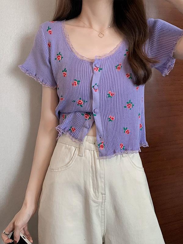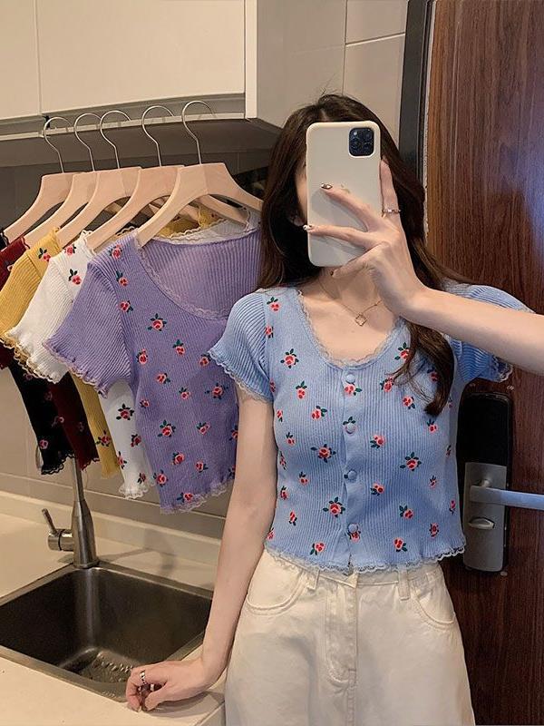 Age-reducing Floral Knitted Bottoming Shirt Short Sleeve